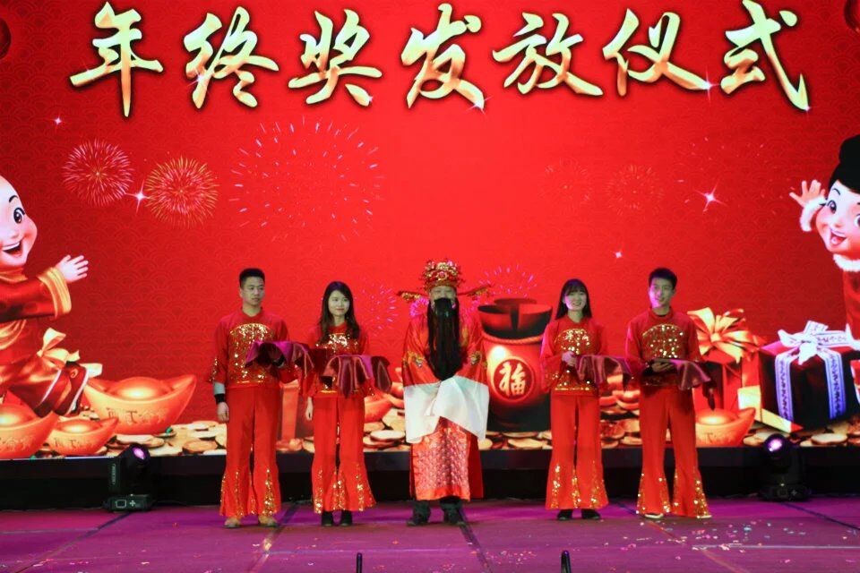 接下来,最期待、最欢快的环节来了——年终奖发放仪式。何总装扮成财神爷的模样,带着四个童子欢乐登场!