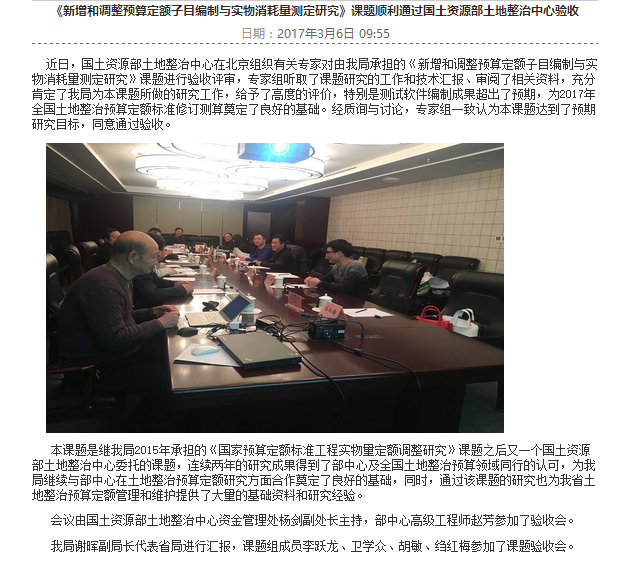 《新增和调整预算定额子目编制与实物消耗量测定研究》课题顺利通过国土资源部土地整治中心验收
