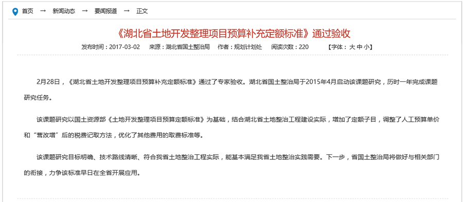 《湖北省土地开发整理项目预算补充定额标准》通过验收