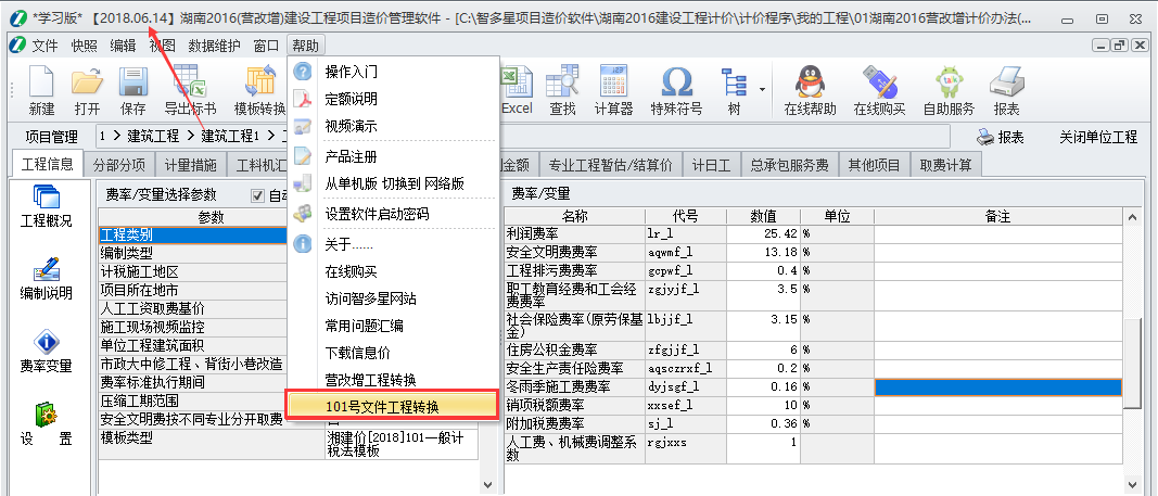 湖南2016计价程序已增加了最新101模板,并做了相应的转换工具,可将160号文的工程一键转换,分“转换”与“刷新”两部分,具体操作如下: