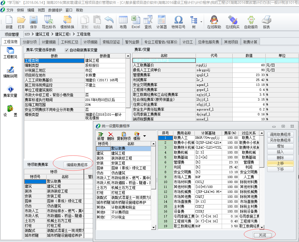 1. 在【工程信息】界面的“费率变量”窗口, 点“编辑取费程序” , 打开后关闭, 然后在弹出的对话框中根据提示点“是”,即可刷新取费;