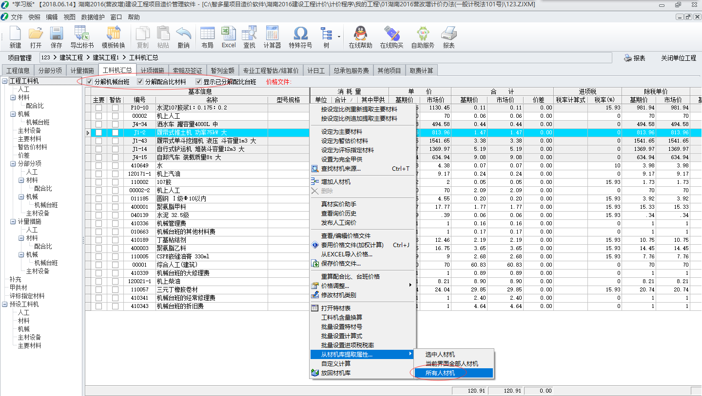 2.进到【工料机汇总】界面, 重新提取下材机(主要是进项税税率): 任意点击一行,点右键-从材机库提取属性-所有人材机,这样提取即可。
