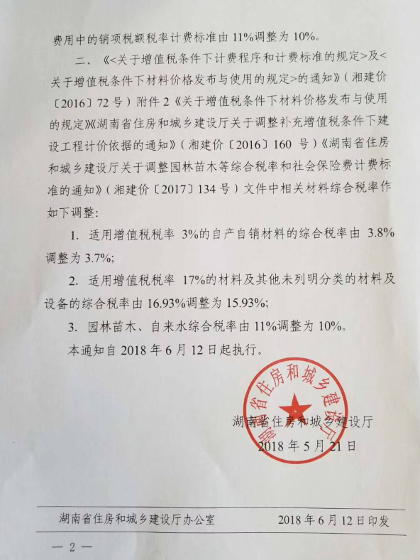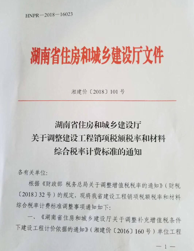 关于湘建价〔2018〕101号调整建设工程销项税额税率和材料,综合税率计费标准调整如下: